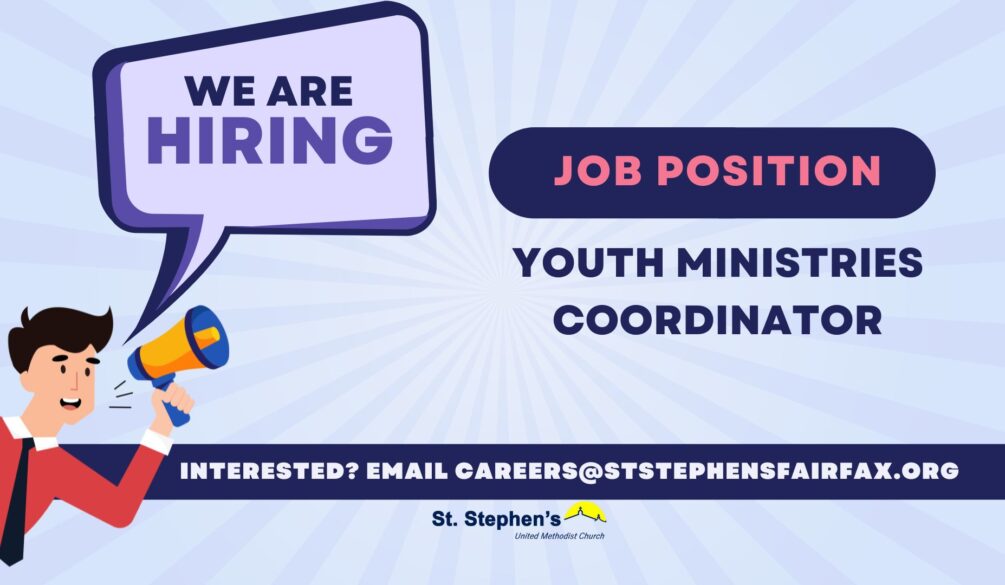 Job Summary: The Youth Coordinator works to fulfill St. Stephen’s UMC’s Youth Ministries’ mission of “Connecting youth to a loving environment that fosters a relationship with God and our neighbor.” As the overall Coordinator for a comprehensive youth program for 7th-12th graders and their families, the Youth Coordinator works with the pastoral staff and a team of church volunteers to develop a vibrant ministry based on its core values: welcoming, service-oriented, God-led, and fun. To apply, please submit your resume, along with a cover letter to office@ststephensfairfax.org.